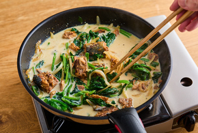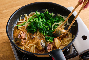 ほうれん草、さばみそ煮缶を汁ごと加え、さばを食べやすい大きさにほぐしながら2分ほど炒めます。