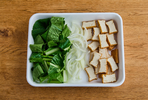 厚揚げは食べやすい大きさに切ります。小松菜は4cm長さに、玉ねぎは薄切りにします。卵は溶きほぐします。