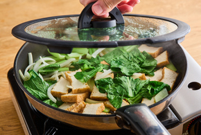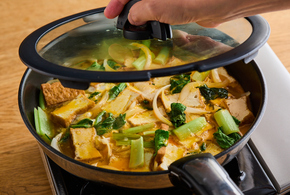 フライパンにA、厚揚げ、小松菜、玉ねぎを入れて中火で熱します。煮立ったら弱火にし、蓋をして5分ほど煮ます。