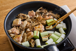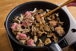 フッ素樹脂加工のフライパンに鶏肉の皮目を下にして、まいたけと一緒に並べ、中火で4分ほど焼きます。