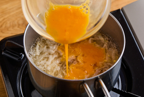 切り干し大根がやわらかくなったら、溶き卵を回し入れます。30秒ほど煮て卵が浮いてきたら火を消します。