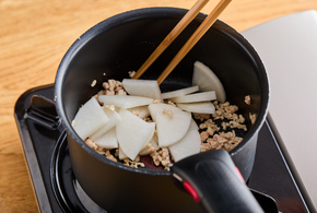 鍋にごま油を入れて中火で熱し、ひき肉を炒めます。色が変わったら、大根を加えて軽く炒め合わせます。