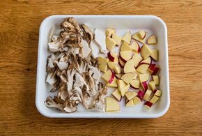 まいたけは手でほぐします。さつまいもは5mm幅のいちょう切りにし、水に3分ほどさらします。
