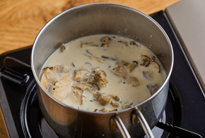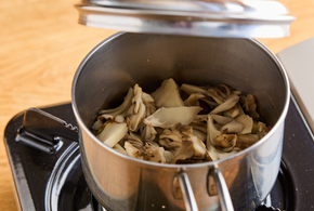 鍋にまいたけ、さつまいも、和風だしの素、水を入れて中火で熱し、煮立ったら蓋をして弱火で5分ほど煮ます。