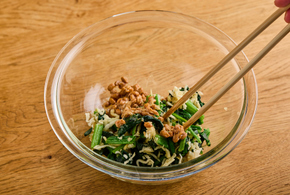 ボウルに残りのめんつゆ、納豆を入れて混ぜ、2を加えてあえたら出来上がりです。