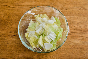 キャベツは食べやすい大きさに切ります。耐熱ボウルに入れてふんわりとラップをし、電子レンジ(600w)で3分加熱します。