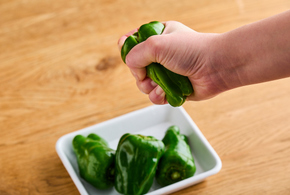 ピーマンは手でにぎってつぶします。鶏肉は食べやすい大きさに切ります。