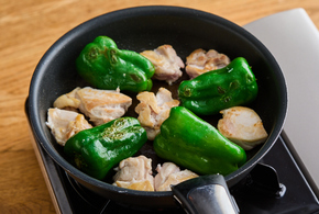 フライパンにサラダ油を中火で熱し、鶏肉とピーマンを並べます。両面に焼き色が付くまで3分ずつ焼きます。