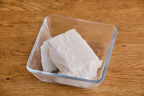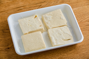 豆腐はペーパータオルで包み、耐熱容器にのせて電子レンジ(600w)で1分半加熱をして水切りをします。