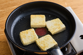 フライパンにサラダ油を中火で熱し、豆腐を並べて焼き色がつくまで両面3分ずつ焼きます。焼き色が付いたら器に取り出します。