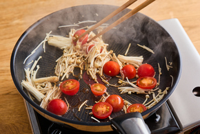 同じフライパンにえのき、にんにくを入れて2分ほど炒めます。香りが立ったら、ミニトマト、めんつゆを加えて2分炒めます。
