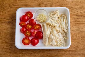 ミニトマトは半分に切り、えのきは3等分に切ります。にんにくはみじん切りにします。