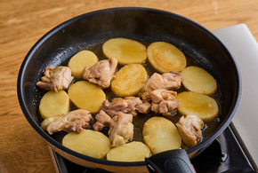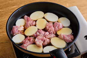 フライパンに鶏肉の皮目を下に並べ、まわりに長いもを並べます。Aを加えて中火にかけます。