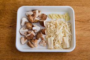 しいたけは十字に切り、えのきは3等分の長さに切ります。にんにくは薄切りにします。