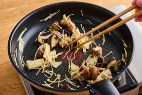 フライパンにオリーブ油、にんにく、赤とうがらしを入れて中火で熱します。香りが立ったら、きのこを加えて2分ほど炒めます。