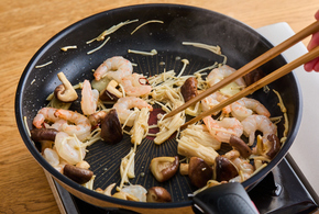 きのこに油がまわったら、えびを凍ったまま加えます。えびが溶けたら、酒をまわしかけて2分ほど炒めます。