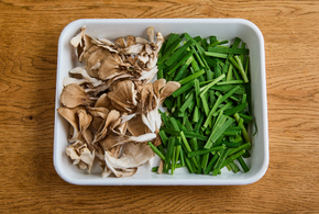 まいたけは食べやすくほぐし、にらは3cm長さに切ります。