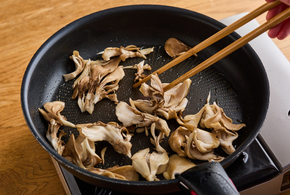フライパンにごま油を入れて中火で熱し、まいたけを加えます。香りが立つまで2分ほど炒めます。