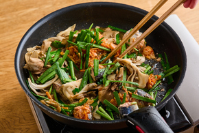 まいたけに油がまわったら、さば缶を汁ごと、白菜キムチ、にらを加えます。2分ほど炒め、にらがしんなりしたら出来上がりです。