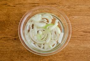 玉ねぎは繊維に対して垂直に1cm幅に切り、たっぷりの水に15分以上さらします。