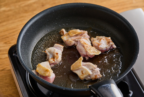フライパンにサラダ油を中火で熱し、鶏肉を並べます。両面に焼き色がつくまで、2分ずつ焼きます。