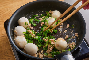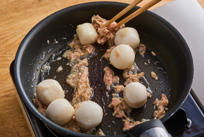 フッ素樹脂加工のフライパンにツナを油ごと入れ、中火で1分炒めます。里いもと鶏がらスープの素を加え、さらに1分炒めます。
