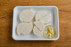 長いもは1.5cm厚さの半月切りに、しょうがはせん切りにします。