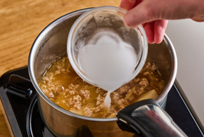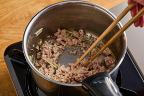 鍋にサラダ油、しょうがを入れ、中火で熱します。香りが立ったら、ひき肉を加えて色が変わるまで炒めます。