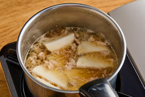 長いもとAを加え、ふつふつとしてきたら弱火にし、落とし蓋をして8分煮ます。