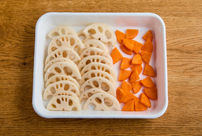 れんこんは5mm厚さの半月切りに、にんじんは5mm厚さのいちょう切りにします。