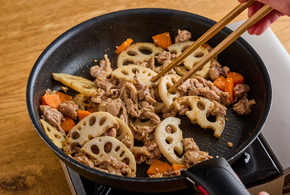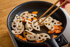 3のフライパンにれんこんを並べ、その上ににんじんをのせ2分焼きます。れんこんに焼き色が付いたら、さらに2分炒めます。