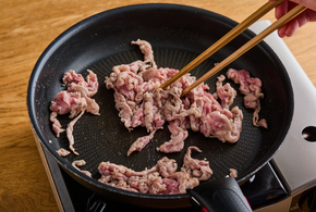 フライパンにサラダ油を中火で熱し、豚肉を入れて2分ほど炒めます。色が変わったら一度取り出します。