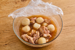 鶏肉は食べやすい大きさに切ります。耐熱ボウルに鶏肉とAを入れ、調味料が全体になじむように混ぜ、10分ほど漬け込みます。