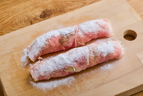 豚肉を少し重ねながら広げ、全体にこしょうを振ります。キャベツをこんもりとのせ、しっかり押さえながら巻きます。