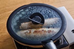 焼き色が付いたら、水を加えて蓋をし、弱火で2〜3分蒸し焼きにします。