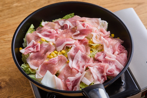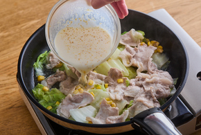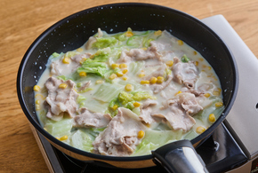 フライパンに白菜、コーン、豚肉の順に重ねます。水を加えて蓋をし、豚肉に火が通るまで弱めの中火で8分煮ます。