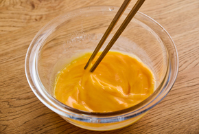 卵を溶きほぐし、牛乳、砂糖、塩を加えてよく混ぜます。