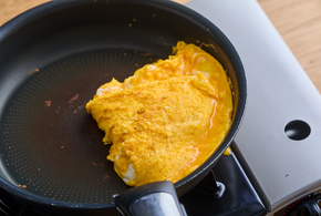 フライパンにバターを中火で熱し、卵液を流し入れます。菜箸で軽く混ぜ、半熟状になったら奥から手前に半分に折りたたみます。