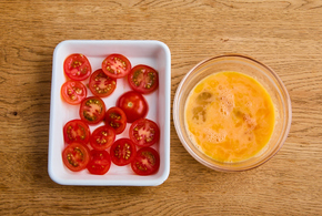 ミニトマトは縦に3等分します。卵は溶きほぐし、塩を加えて混ぜ合わせます。食パンはオーブントースターでこんがり焼きます。