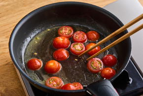 フライパンにバターを中火で熱し、ミニトマトを加えて1〜2分炒めます。