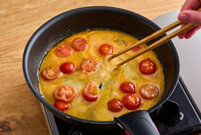 ミニトマトがくたっとしてきたら、溶き卵を加えます。卵が半熟状になるまで混ぜたら火を消します。