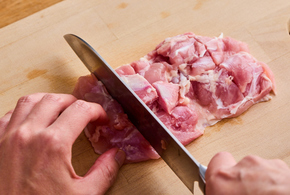 鶏肉は皮目を下にしてまな板の上に置き、筋を断つように4本切り込みを入れます。