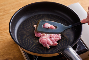 フッ素樹脂加工のフライパンを弱めの中火で熱し、皮目を下にしてのせます。フライ返しで押さえつけながら4分ほど焼きます。