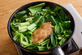 皮目に焼き色がついたら裏返し、空いているスペースに小松菜を加えます。小松菜を炒めながら3〜4分焼きます。