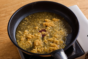 鶏肉と小松菜を取り出し、空いたフライパンに混ぜ合わせたソースを入れて弱火で2分ほど煮ます。