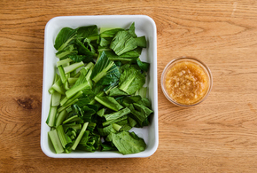 小松菜は食べやすい長さに切ります。玉ねぎとしょうがはすりおろし、Aと合わせます。