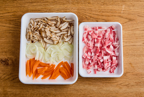 ごぼうは縦半分に切って斜め細切りにし、玉ねぎは薄切りに、にんじんは短冊切りにします。豚肉は1cm幅に切ります。
