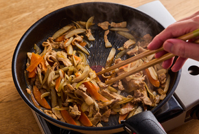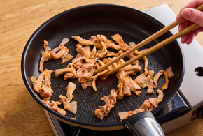 フッ素樹脂加工のフライパンに豚肉を入れて中火にかけ、色が変わるまで2分ほど炒めます。