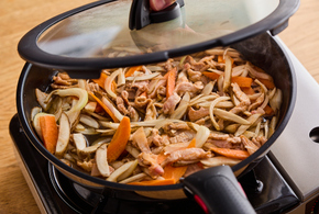 ごぼう、玉ねぎ、にんじんを加えて全体に炒めます。油が馴染んだら、めんつゆ、みりん、水を加えて蓋をして5分ほど煮ます。