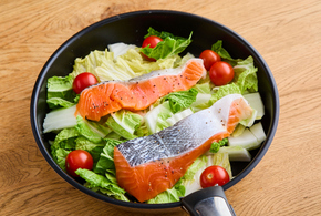 フライパンに並べて蒸すだけ、鮭のうま味を洋風で楽しむ一品。鮭はビタミンDを含み、骨の健康を意識したい方にもおすすめです。